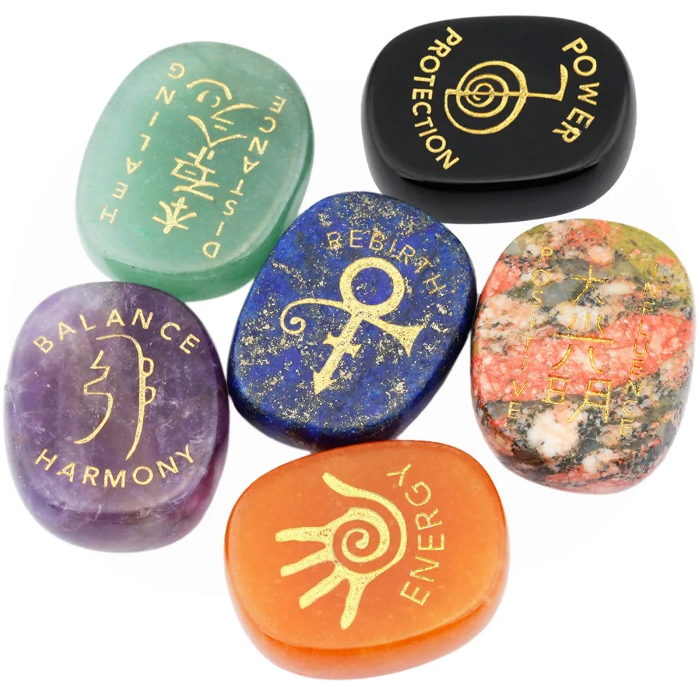TUMBEELLUWA 6Pc/Set Engraved Stone Pocket Palm Stone Healing Crystal Reiki Balancing